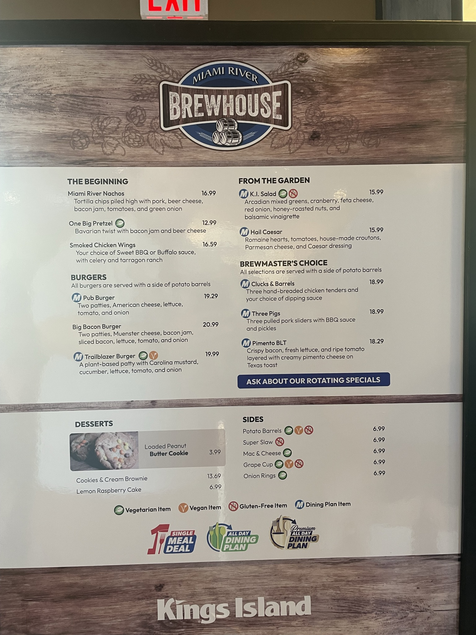 Earlier today I saw a photo of a meat (?) sandwich on a burger bun cut in half with a bowl of mac & cheese in between the two halves. Does anyone know what Kings Island food item that might be? It looked to be from French Corner, but it wasn't the shrimp po boy or the new crowaffle breakfast sandwich. It looked to be really nicely presented so I'm wondering if I should see about trying it. I wish they would've kept some form of hot dog on the Brewhouse's menu instead of making it a Chef's Special item — though I do appreciate that the new hot dog is available for the meal plan. In case anyone would like to see, here is the 2026 standard menu at the Miami River Brewhouse. As you can see, the prices now range from $13 to over $20 for the entrees. I also noticed that they don't have a price for fountain beverages listed anywhere, which would be nice to know if I didn't have the drink plan. Some of these prices are ridiculous, but I think most guests know to either buy a dining plan or eat outside of the park. Speaking of the meal plan, do you like that the meal plan and drink plans are separate or do you wish the two were combined for a slightly higher price? I prefer them to be separate. - Today