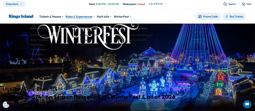 Our Thursday night visit to Winterfest was rather nice because of the small crowds and friendly associates. The operations were remarkably slow in some areas and perfectly fine in others — both of which are completely understandable and acceptable for me. I had expected high crowd levels because of the warmer weather, but it looked like the rain kept a lot of them away. We had dinner at Rivertown Potato Works where I had a nice Coca-Cola and some Bacon and Cheese Fries while my group member got the Honey Ham Fries and a drink. My fries were a little under-cooked, but the bacon bits and cheese improved them a lot. Personally, I like the under-cooked fries a whole lot more than the burnt Potato Works fries I've had in the past. I had wanted to get some ice in my Coke but the nice associate had already started filling the cup with pop before I could request any ice. We rode the train and got to enjoy a break in the rainy weather. There were more lights out this week than before, but it looked like there were associates out along the route that were working to either get them lit or to get them ready for heavy rainfall. The engineers had us absolutely hauling our way along the track, but we still had to make the stop at the end before Mystic Timbers despite being the only train operating. I'm curious to know why they started making that scheduled stop this year when it hasn't been made most other times. Also, if that stop becomes a more permanent feature then I'd love to see either more decorations along that guardrail or some kind of display to entertain guests while they're stopped. A little stop into the Rivertown LaRosa's led me to find out that the ice machine in there was dispensing about 5-8 oz of ice with the quickest of presses. It was also interesting to find out that my Coke was nicely mixed while my group member's Coke was not well mixed at all. The Shooting Star section of Winterfest Way was very nice to walk through again. I did notice that the small back-most passenger window of the purple car is now missing — which certainly cannot be good for the interior and the longevity of the car's life in the park. The version of A Christmas Carol playing was one that I've never seen before. It was older and had a staunch difference in quality compared to the chopped up version of It's A Wonderful Life that they play. We walked over to Area 72 to look around and I noticed that there was a Firehawk oil can just like the one found up front in the Kings Island Trading Co. hidden among the display at Flight of Fear's exit. The last part of our night consisted of sitting on the warm Coney Bar-B-Que porch to catch up on some messages and decide our next steps. The two announcements for the early closing were clear and concise, but seemed to be presented awkwardly. I'll chalk that up to the fact that some information was accidentally skipped in the first announcement. It was super rainy as we exited the park, so we stopped into the Starbucks dining room (which should definitely be connected to a park-owned restaurant instead of Starbucks). I'd forgotten how nice and large that room was. Getting back to our cars was very wet, and I wish there was an easy way for the park to fix all of the drainage channels so there wouldn't be as large and deep of puddles everywhere. Overall it was a good night despite all of the rain and leftover snow. The only things I think the park could easily do to improve guest experience on nights like this would be to make sure the french fries are fully cooked and to have associates with dry mops in the restrooms every so often to make sure the floor isn't so slippery. I nearly slipped a few times around the park with how wet all of the indoor floors were (particularly in the arcades, restrooms, and shops).