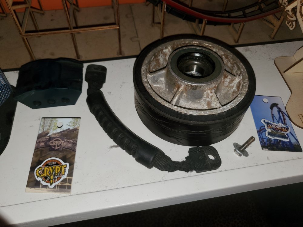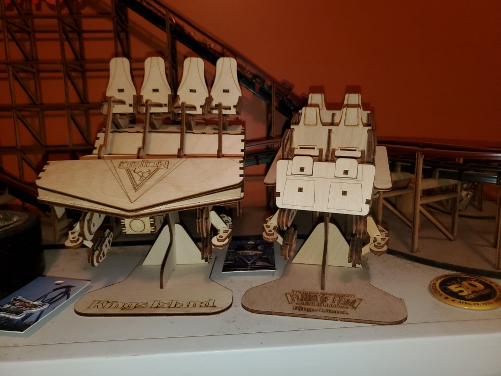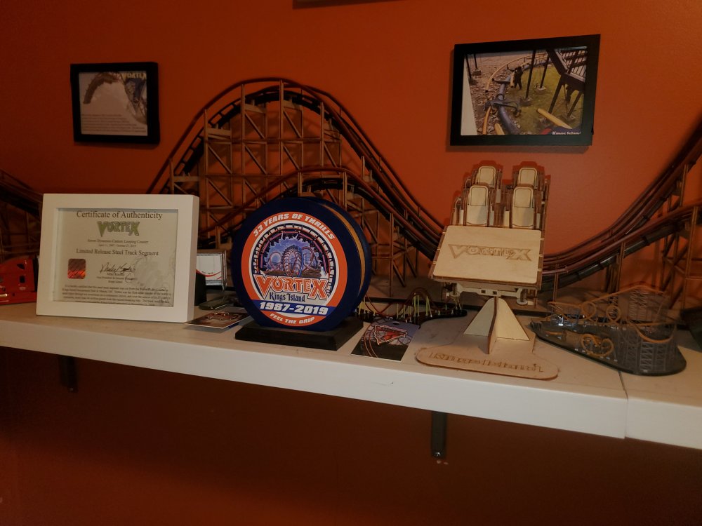 It has a great home!! I also have 2 Vortex shirts. And a hoodie from Busch Gardens Tampa Also heres my Vortex memorabilia (The cutout, nanocoaster, pin, and my holy grail!!! The track slice!! ) My Arrow Dynamics wheel, RMC Grab handle and Anti Rollback pad, and Huss Breakdance bolt My cutouts of Orion, Sheikra at BGT, Flight of Fear, and The Bat!! And nanocoasters of Iron Gwazi, Storm Chaser, and Lightning Run. (Last 3 Not pictured) Also i have 2 fully functional Coasterdynamix models. Also I have a night shot I took of Vortex right after my final ride, with tears in my eyes. Sorry for the long post, i figured I'd show off my collection here!! (If you guys are interested)3 points
