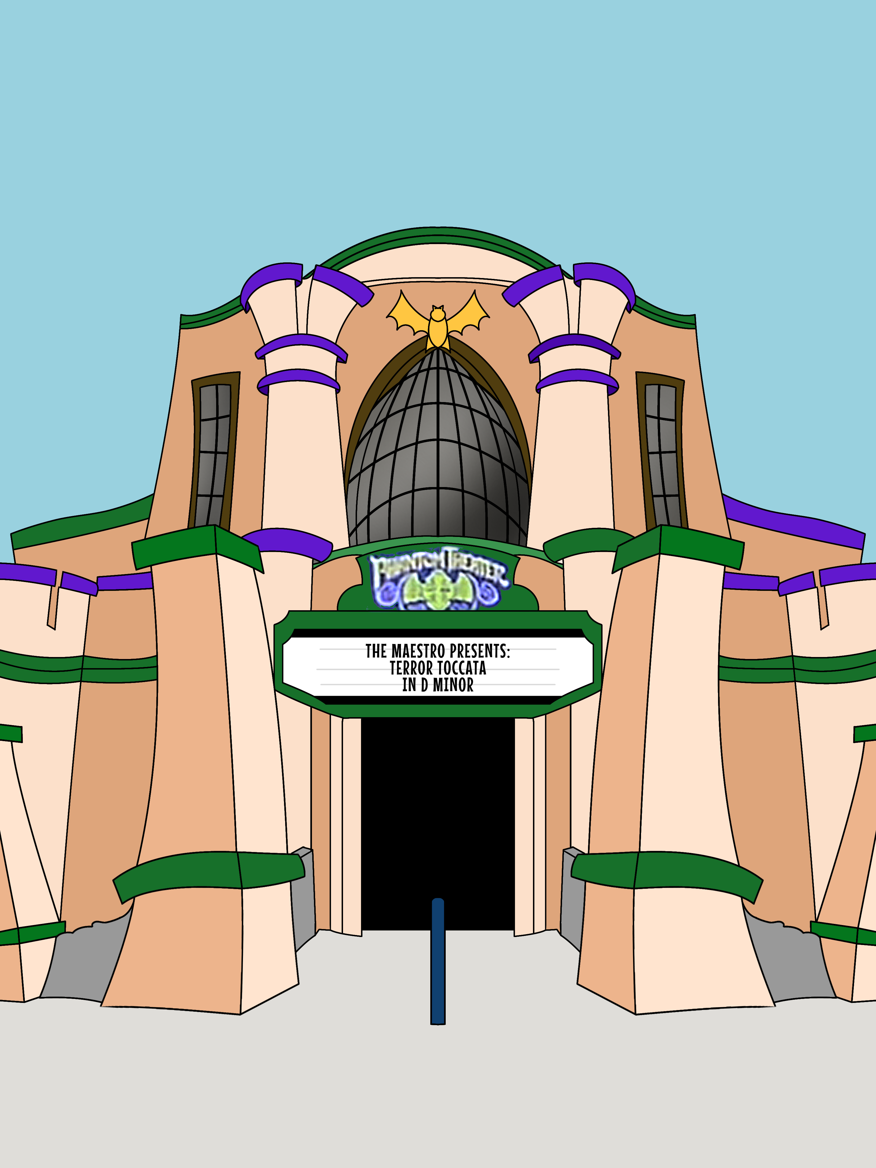 These are some very quick sketches I made, but this is sorta how I’m predicting the entrance will look like. At this point, I’m not expecting them to massively demolish the whole facade and more so do a paint job and overlay to make it look different enough to recognize it’s a different attraction, but not anything major since I think a majority of the budget is going into the animatronics and theming. I didn’t want to draw it, but especially since they’re canonically ghosts at this point, I think a small detail to add that would go a long way is putting tombstones in the grassy section of land to the right on the entrance.5 points