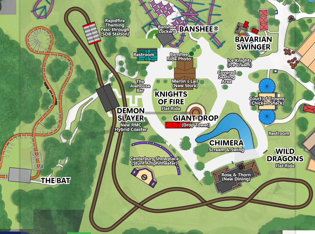 Here's a midway point check in on my Medieval Faire redesign of Action Zone! I'll go through my changes below in case anything isn't clear. It's kind of like the Medieval Faire area at Canada's Wonderland in terms of initial vibes, but it could be a little more Ren Faire village than castle village. Chicken Shack gets renamed to Court of Crowns; keeps a similar menu with a new presentation style. The seating areas are enclosed like at KD. Drop Tower is renamed to Giant Drop. A new RMC hybrid coaster called Demon Slayer is built to span I wanted to incorporate an element that would resemble a 40 degree loop (I can't remember the name, but its like halfway between a vertical loop and a helix), but couldn't figure out where to put it. It has a lift hill structure like Iron Gwazi, some nice inversions, and a Son of Beast station pass-through similar to the Yeti scare on Expedition Everest. The track would be black and could have one section with red, orange, and yellow track to call back to the Screamin' Demon. Three new flat rides are added, including an S&S Scream n' Swing that goes over the lake left over from Congo Falls. Knights of Fire (a callback to the nighttime show at some Cedar Fair parks) and Wild Dragons aren't specified because I can't figure out what they could be. Delirium is "moved" to be a part of Oktoberfest and renamed. A small part of Timberwolf is retained and turned into a permanent stunt show amphitheater. Banshee's lockers are integrated into the line under the station. The ride photo booth is put in a new building near the exit (like Orion has). A new building containing a ride photo booth and a new store, Merlin's Lair, is constructed and includes a covered pass-through. A new restaurant (this iteration is based off of Coney Bar-B-Que) is built near Chimera and Wild Dragons. I'd like to also see The Bat's entrance moved in this iteration to go between Demon Slayer's entrance and the new amphitheater entrance. I tried to lay out the pathways a little differently than they currently are. Personally, I'd be fine with losing the center path and turning it into a ring path. The trees would also get saved as much as possible. Take the names and exact locations with a grain of salt. I hope you enjoy!4 points