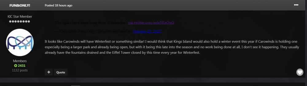I think most states and municipalities in this country have all but ruled out another lockdown. It seems pretty clear at this point that it would be almost impossible to implement and enforce. People just aren't going to go for it. Unless things get drastically worse (worse than this past spring for sure), efforts would be better focused on mask wearing, social distancing, and other measures to reduce transmission, that people may be more receptive to. We're going to have to learn to live with the virus. Unfortunately that means a lot more people are probably going to get sick and die. Hopefully an especially effective vaccine is available soon, but even that isn't likely to completely eliminate the virus. I'd be surprised if anything happens to KI or CP over the next couple weeks, but it's hard to envision a spring opening without some of the same restrictions and regulations currently in place. We're roughly six months from this year's planned opening date, as well as when they would presumably open next year. Six months feels like a lifetime ago, so who's to say what will happen between now and April? The only thing that would surprise me is if life is back to the old normal by then.