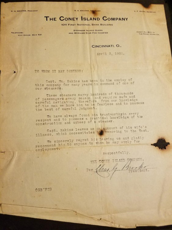 I have inherited my great-grandfather's steamboat possessions. His name was Captain William Eakins and was a 4th generation steamer from Dayton, Kentucky. He worked for the Coney Island Company for several years until 1920. I attached a few photos from his album as well as a letter from when he retired. I started scanning the album and letters, and have uploaded them to here: https://imgur.com/a/EjWNO