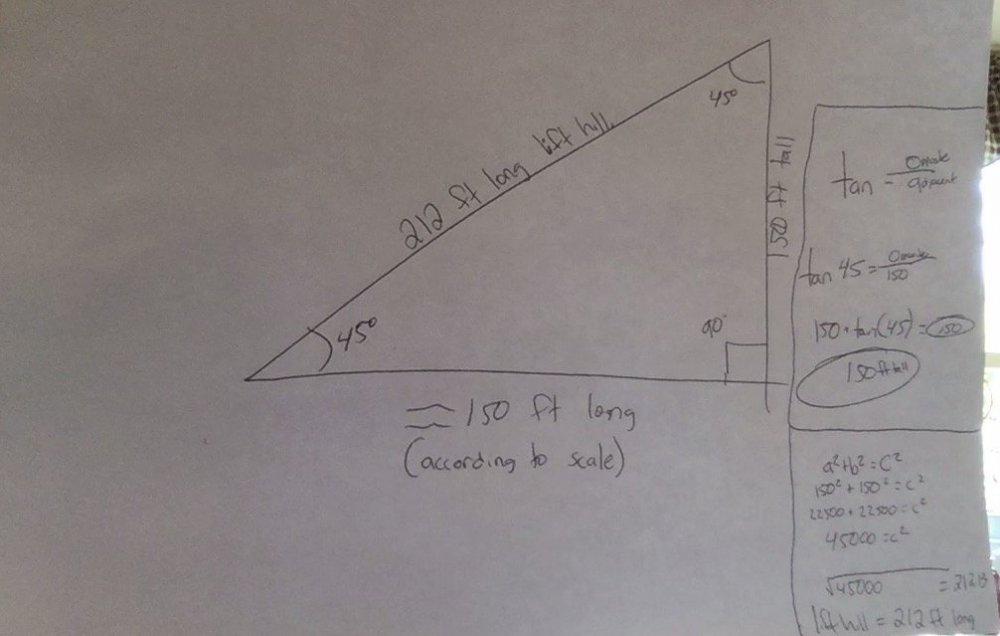 If you find the length of the base of the lift hill (so the horizontal length running from start of lift hill to the end of lift hill). you can use trigonometry to figure out the lengths of the other side. because you already have the 45 degree angle measure