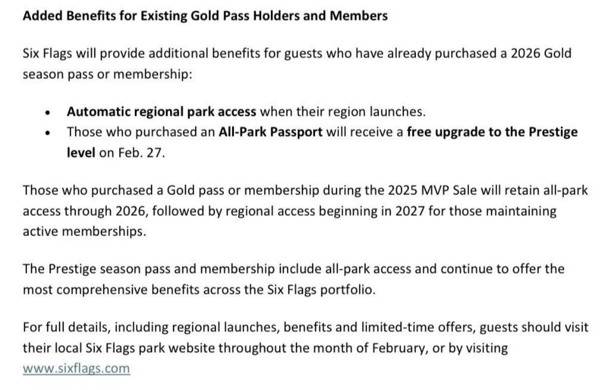 Six Flags has unveiled a new pass structure for their parks. Gold Passes will now allow access to parks in certain regions, whereas Prestige Passes will allow access to all Six Flags properties. If Gold Passholders purchased an All Park Passport for 2026 (excluding ones given out during the MVP sale), their Gold Pass will be upgraded to a Prestige Pass for 2026. edit: It seems the All Park Passport will still be available as an additional add-on for Gold Season Passes. Though it remains to be seen what exactly the prices would be for a Gold Season Pass with the All Park Passport compared to just buying a Prestige Pass that already has that included. -