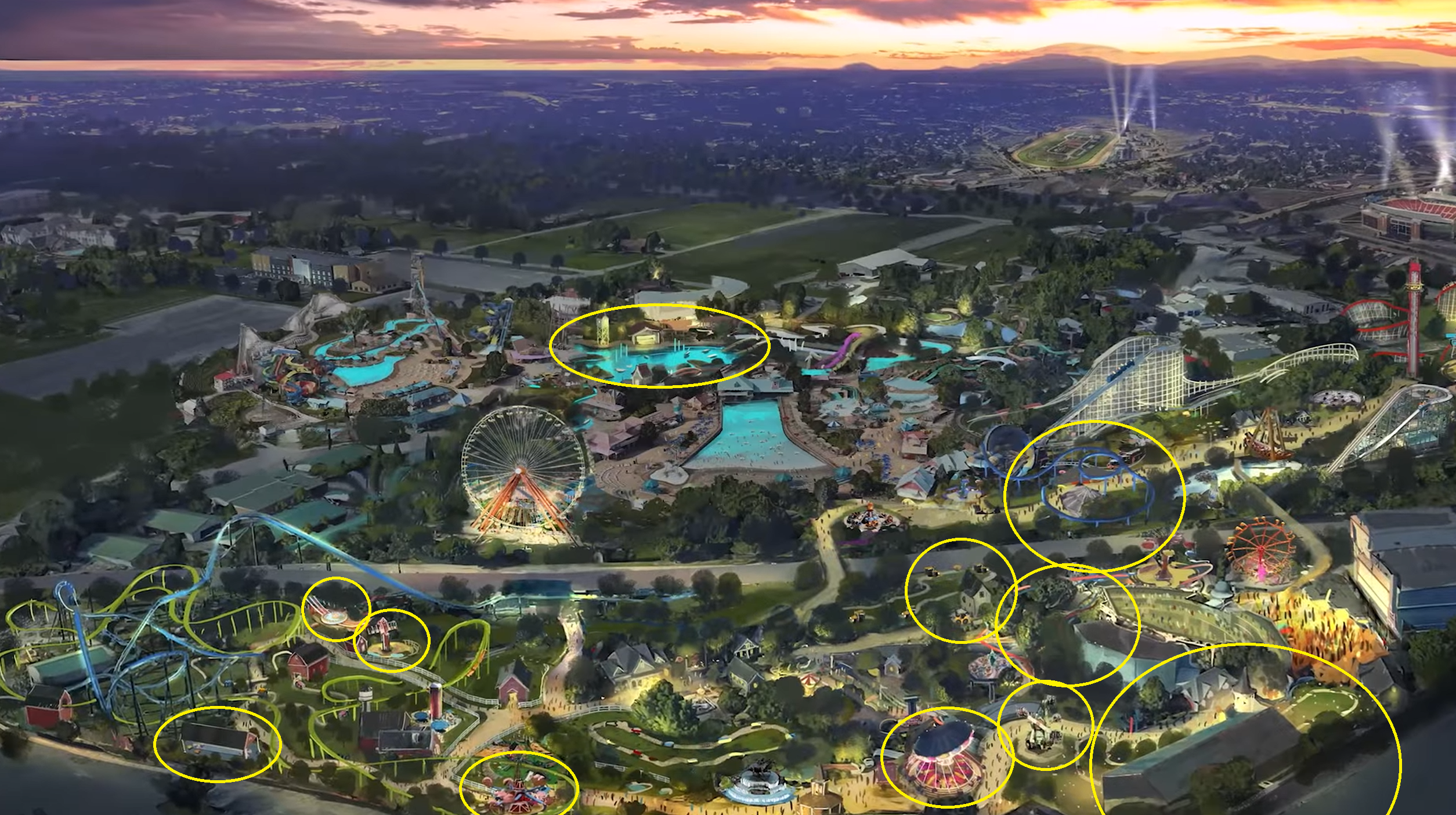 I have the full version of that image here. I might miss some things, but here's some of the new additions I've been able to find in counter-clockwise order: Looks either like a Junior Whip ride or a relocation of the bumper cars in the bottom left corner Zamperla Disc-O and Barnyard near Lightning Run Looks like a Flying Carousel ride similar to Dumbo at Disneyland. It's hard to tell specifically, but it seems to resemble flying pigs. Located to the left of the entrance A Zierer Wave Swinger and Zamperla Nebulaz to the right of the entrance An attraction with white track. (Himalaya appears to be removed or relocated somewhere else in the park) Some sort of red-tracked addition to the left of the showstage. This also could just be decorations. Tin Lizzies seems to be rethemed with tractors A blue coaster in the plaza area of Discovery Meadow. This might actually just be Hollyhock and Roll, as some attractions don't appear to be in the right areas in this rendering. Some sort of new pool area in the waterpark. This also looks to be some sort of show stage as well. -