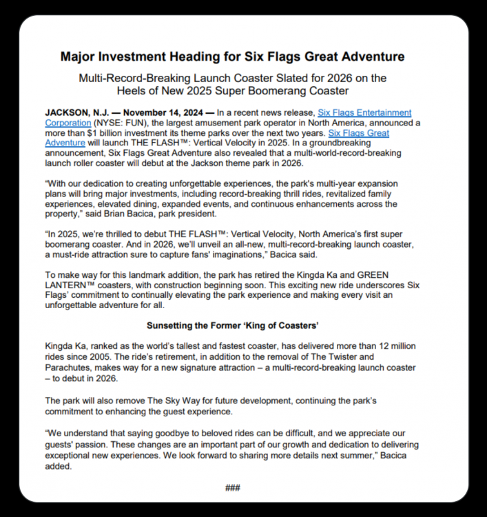 Same here. I thought Intamin should have been involved in the TT2 project from the beginning. I do think it's probable that we will see a similar conversion of Kingda Ka seeing as there's not any demolition permit filed for it like there is for greenlantern, parachute ride, and twister. Also, it is official now that they are removing their skyride. Happy 50th anniversary Great Adventure! Your new coaster didn't open, your log Flume refurbishment got WAY behind schedule, and they just closed two of your major coasters, your top spin, and your skyride. As for six flags over Texas, la vibora and El Diablo getting removed was predictable but I'm still saddened by the fact that it was the last Intamin bobsled still in operation meaning that coaster model is now extinct. I do think the new dive coaster is a great addition for that park though and I hope to get back down there soon especially considering that I love shockwave and with the current trend of closures, I frankly don't trust the new six flags chain to keep maintaining classics like that. Also I'm very interested what we'll see going to magic mountain in 2026...