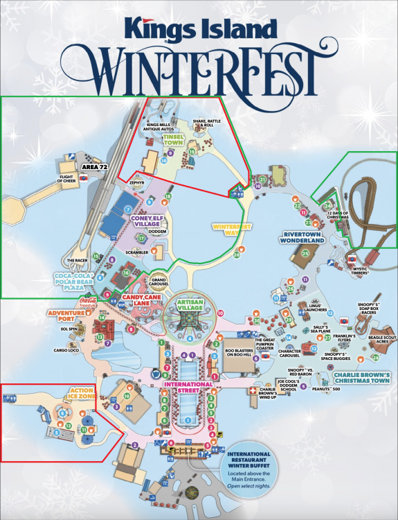 I have to wonder who in SF corporate wants to get rid of the winter events because (as we've said) it's looking that way. Fall and Winter events are the prime time to bring guests back and have them spend more money. They also, notably, add a lot of value to a season pass! So many people have remarked about the perceived value that Haunt and Winterfest add to their season passes, so why take that away (genuine question)? I cannot believe that most of the winter events held on that long without making enough money. It feels like it'd be a very slippery slope to cancel even more events next year. I could more see them scaling the event down like this, first closing the areas outlined in red, then the ones in green if they need to cut even more. Cutting more than that would probably jeopardize the quality of the event too much (after already taking it down to the size of the 2005 event). As for changing up the ride lineup, I'd vote to add Woodstock Express over Adventure Express if it needs another roller coaster. Losing the most accessible indoor attraction for this year's event is sad, but I think it's well worth it for Phantom Theater: Opening Nightmare. I'd love it if they could turn one of the arcades into a warming station, though moving all of the equipment into temporary storage might be too much work. Maybe I'll try to come up with my own Winterfest wish list and post it somewhere here.