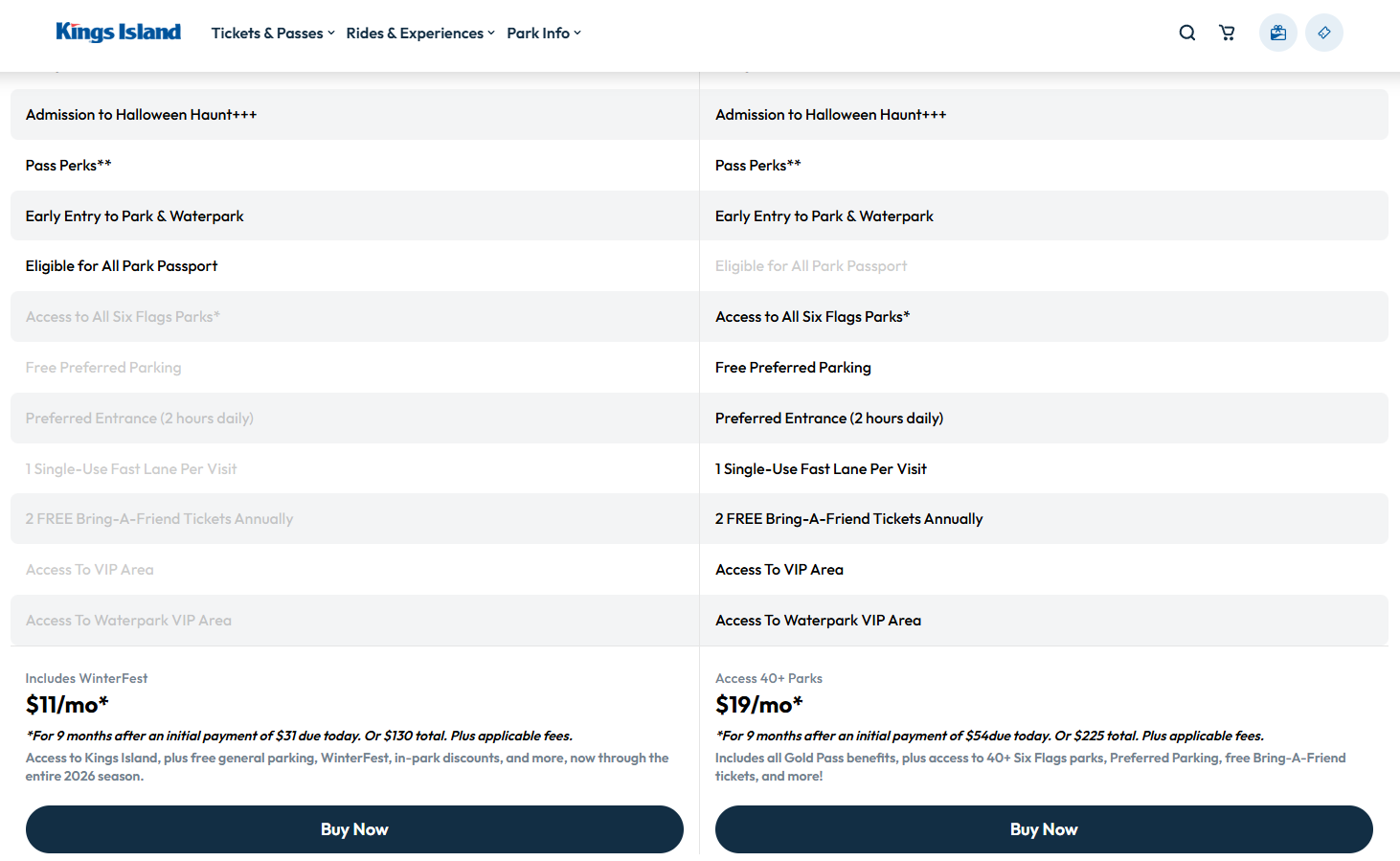 The MVP Sale has finally come to a close after more than three months. Now a Kings Island Gold Pass is priced at $130 total without the All Park Passport while the Prestige Pass is priced at $225 total with the All Park Passport included in its price. I've been unable to access the purchasing page, but the APP at SF Great America is currently priced at $55. Personally, I believe the Prestige Pass is still priced far too low for the benefits it provides, but the Gold Pass is getting back to a more reasonable price. Should Six Flags have cut off the MVP sale after its first extension? Yes. Is it good that they have finally removed the APP from the Gold Pass? Also yes. I hope we can see more reasonable sales and minimal extensions in the future. Also, if the Silver Pass is brought back for any reason I think it should include blackout dates as a replacement for not including Haunt and Winterfest. Let everyone experience the whole year of events while making sure there is still a good reason to upgrade to a Gold Pass. -