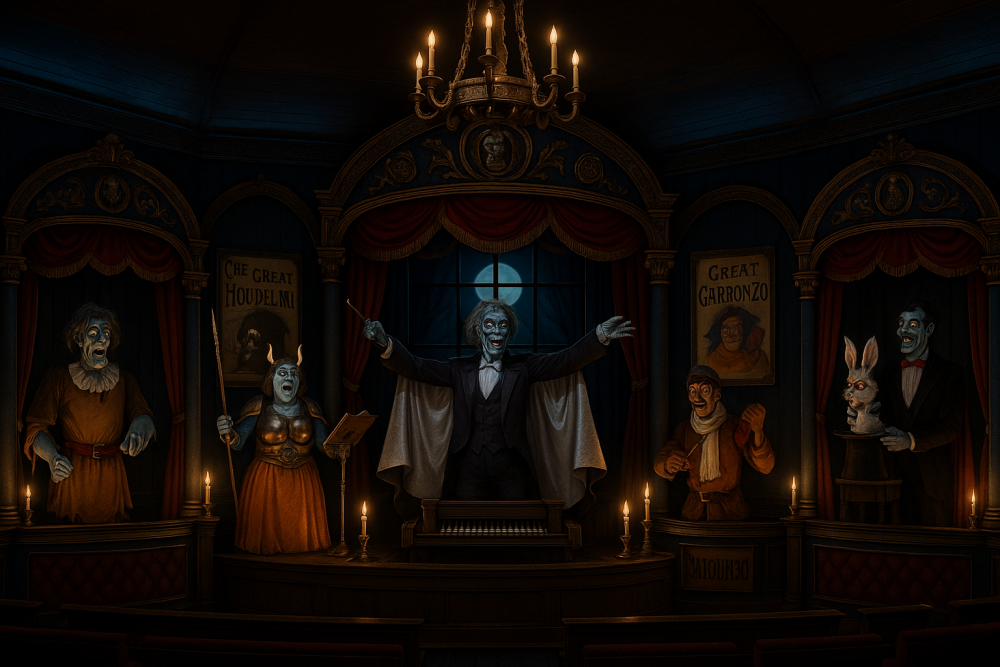 Amongst the many Phantom Theater threads on this forum, this one aims to take a different approach. I’ve been thinking about this alternate version of Phantom Theater and wanted to share the idea in case anyone else has imagined something similar. Basically, picture a scenario where Kings Island didn’t originally build Phantom Theater as an omnimover dark ride in the Haunted Mansion style. Instead, imagine they took the exact same characters, atmosphere, portraits, parlor rooms, and ghostly humor, but turned the whole thing into a fully animatronic stage show. Guests would still have to enter through the lobby and listen to Maestro taunt them, but instead of loading into ride vehicles, they’d take their seats in a large Victorian theater filled with red velvet curtains, flickering candles, gilded arches, and multiple small stages. Maestro, Hilda, Houdelini, Garbonzo, Lionel and the rest of the Phantom Theater cast would appear as animatronic performers, each popping out on their own miniature stage to sing, argue, perform magic tricks, or attempt dangerous stunts. The whole thing would feel like a mashup of the original Phantom Theater aesthetic with the structure of Country Bear Jamboree or even the old Chuck E. Cheese animatronic shows. In a way, it would basically be what Phantom Theater Encore became, but built entirely around animatronics instead of live actors. Same characters, same humor, same style, just reimagined as a seated ghostly revue instead of a ride-through experience. For added authenticity, scenes like the prop room – the stage hands – the show lights guy, and the boiler room guys would appear as you’re walking through the line going towards the theater area or as you’re leaving. Thoughts?