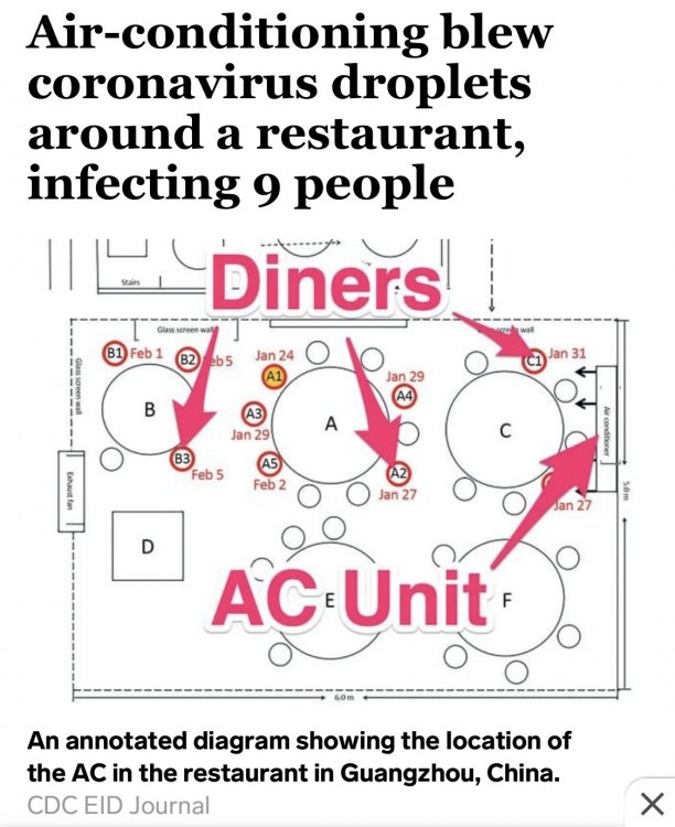 Here’s another area that could be of concern, AC units. Many rides and stores have them. Check out this image from Business Insider showing how 1 affected individual causes a mass outbreak at a Chinese restaurant. -