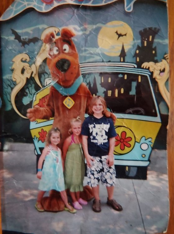 I loved the Scooby-Doo theming for I am a huge Scooby-Doo fan, was disappointed when Scooby-Doo was removed for Boo Blasters, I remember waiting in line and hearing the Scooby-Doo music in the que and the Scooby-Doo themes outside the ride. "LIKE DON'T CHICKEN OUT NOW, GET YOUR BRIGHT LIGHTS READY, SCOOBY-DOO AND I ARE COUNTING ON YOU!" This is a picture of my little sister, niece, and I standing next to Scooby-Doo.