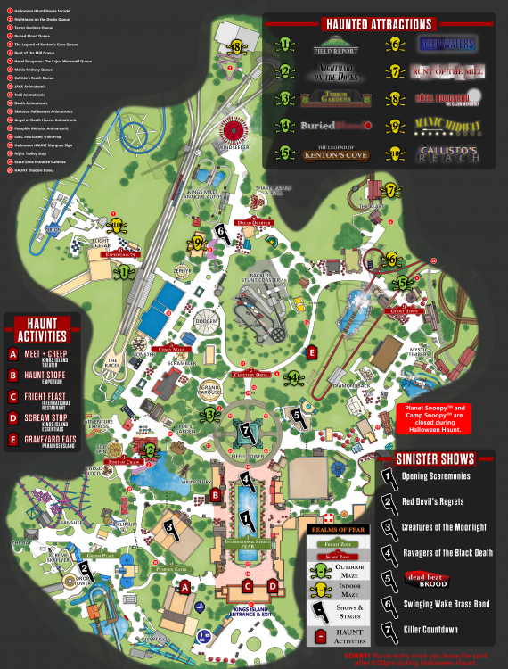 As a lover of all things Halloween and Haunt — and as someone who’s been going since I was about 8 — I’ve witnessed the vast range of KI’s Halloween events. I love love love Haunt! That being said, I think it could use some new ideas. Following is a project I’ve put together over the past month. I tried to keep the park full of nighttime activities with inspiration from KI Halloween offerings over the past 24 years. A brief explainer: Fright Zones (3) are areas of the park in which monsters simply roam. Scare Zones (6) are where the true nature of HAUNT can come alive. Here, monsters will actively prowl and scare anyone who crosses their paths. There are (7) Sinister Shows spread throughout the three Fright Zones, two of which are Opening and Closing shows. Lastly, there are (10) Haunted Mazes spread throughout the Scare Zones, split between five Outdoor Mazes and five Indoor Mazes. All of this should be visible on the map (though you may need to zoom in a little). Anything placed between quotation marks currently exists as a Halloween Haunt attraction at Kings Island. While some of these have counterparts at other legacy Cedar Fair parks, I tried not to copy those when creating this project. The base map is composed of screenshots from the Kings Island mobile app. Most of this was written before the awesome start to the 2024 Haunt season, so if you like something from 2024, put in a reply below! Fright Zones (1) “International Street FEAR” “Step right up to see the strange and mysterious creatures that stalk the shadows and lurk around every corner of International Street. Legend says that these doomed souls are condemned to haunt International Street for the rest of eternity.” Located on International Street. (2) “Pumpkin Eater” “The notorious Pumpkin Eater is on the prowl, hidden within the dark confines of the haunted town he once terrorized. Beware the demons who roam the winding serpentine road. They were townsfolk once, just like you.” Located on the path between the park entrance and Adventure Port. (3) Grimm Place Enter a world of dark myths and stories of old! Hear the fables from their authors and try to remind yourself that none of this is real, right? Located in Action Zone. Scare Zones As with up at Cedar Point, this revitalized Halloween Haunt could utilize gantry structures to alert guests when they are entering the Scare Zone area. (4) Port of Chaos A bustling port community once besieged by pirates in search of the fabled King's Gold. Ancient myths tell of wonders galore, but the locals know what creatures lurk beneath the waves. Dead men tell no tales, so BEWARE! Don’t let your eyes deceive you…these violent delights often have violent ends. Located in Adventure Port. (5) Coney Maul The historic Coney Mall has thrilled amusement seekers for more than fifty years, but recently the thrills have turned into frights! Take a stroll down the mall at your own risk! The creatures are only getting hungrier with each passing night. Located in the northern half of Coney Mall between The Racer and Manic Midway. (6) Expedition 72 When the advanced Expedition 72 returned from its trip to space, it brought back some special alien artifacts; however not all items were satisfied with remaining in their crates. Walk around the base and gaze at the artifacts that are still contained…and watch out for those that managed to escape. Located in Area 72 (7) Cemetery Drive Amongst the graves the mourners weep; Above the ground where the undead creep; As above, so below; Around here your fears will grow. Take a stroll through the old Ride Valley Cemetery and gaze upon the tombstones. The eerie feelings will refuse to subside when the undead come out at night! Located on the path between Rivertown, International Street, and Coney Mall. (8) Dread Quarter It's time for some proper Crescent City fun! Watch The Quarter come alive as the sweet sounds of jazz fill the air. Feel free to engage with the vibrant nightlife, they won’t bite you…yet! Located in the southern half of Coney Mall between Manic Midway, JukeBox Diner, and Hotel St. Michelle. Located between the Rivertown LaRosa’s Pizzeria and JukeBox Diner. (9) Ghost Town “The problem started years ago on the grounds of the newly developed Miami Valley Lumber Company. Men and women, 66 in total, entered the lumber company and were never to be seen again… at least not in the way they used to be. Stepping into Rivertown, outsiders find themselves immersed in a small abandoned lumber village that’s haunted by something mysterious. The forest is overrun by supernatural creatures that have riddled their confines with darkness and despair. Are these the lumber yard workers from days past? And, which of them are evil?” Located in Rivertown Haunted Mazes (1) Circles: Field Report The farmers just outside town have been reporting crop circles and missing animals to the local news, and now crowds are gathering in the fields to witness the next event! Rumor has it the aliens have something else in mind… Don’t get lost in the fields or else you might just end up like the unlucky travelers from the aliens last encounter. Information: Located in Area 72, between the Parade Tent and the Area 72 Beer Cart. Theme: Corn crop circles inhabited by victims of aliens. (2) Nightmare on the Docks The S.S. Pescador has returned to its port of call, but where is her crew? Trod warily through the docks and try to discover the clues of what those sailors were searching for on their forbidden voyage. Tales of Spanish sirenas have long haunted these waters, so heed this warning: there are things far more frightening than a drunken buccaneer! Information: Located under the covered patio at Enrique's. Guests enter by the pond, travel through the maze, then exit near Enrique’s exit opposite the VIP Lounge. Theme: Sirens and their victims seek a chance to lure guests to their deaths. (3) Terror Gardens History repeats itself i